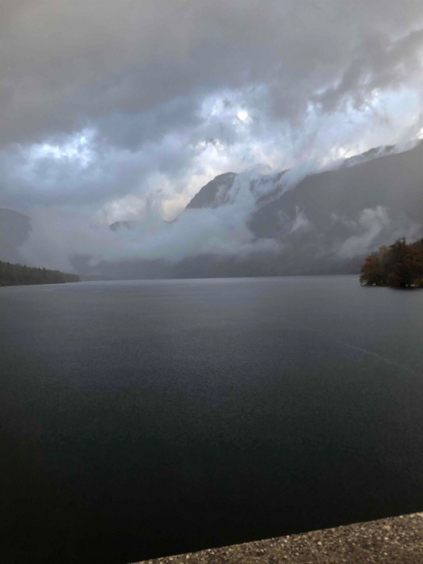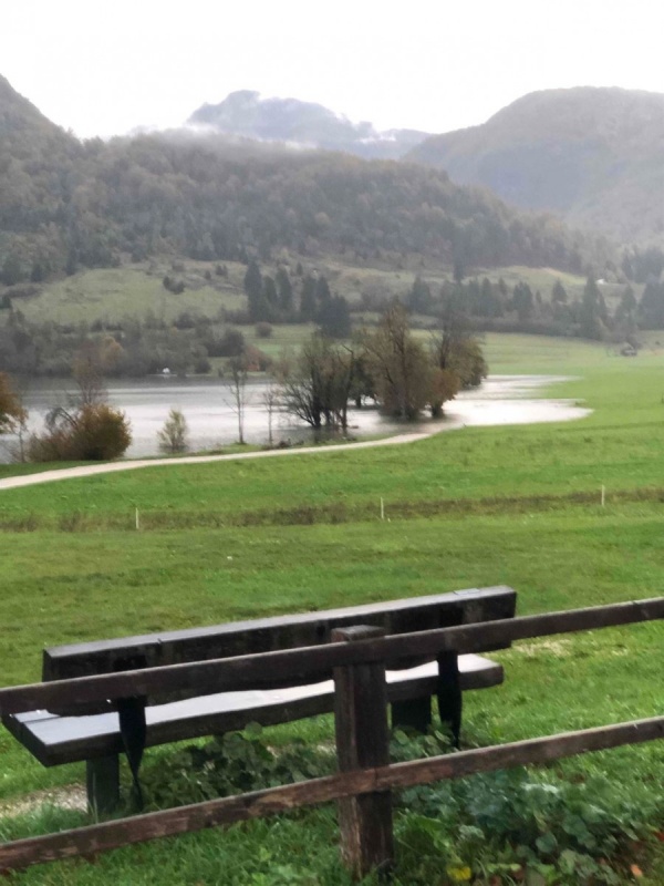 Nekateri z dežnimi plašči, drugi z dežniki, vsi pa dobre volje smo se izogibali lužam, majhnim potočkom in ogledovali ponovno nastalo škodo, podrta drevesa, poplavljeno obalo jezera. Kako drugače v tem času tu, ko ni turističnega vrveža, prometa, srečali smo komaj nekaj osebnih avtomobilov, en turistični avtobus in nekaj delovnih vozil.