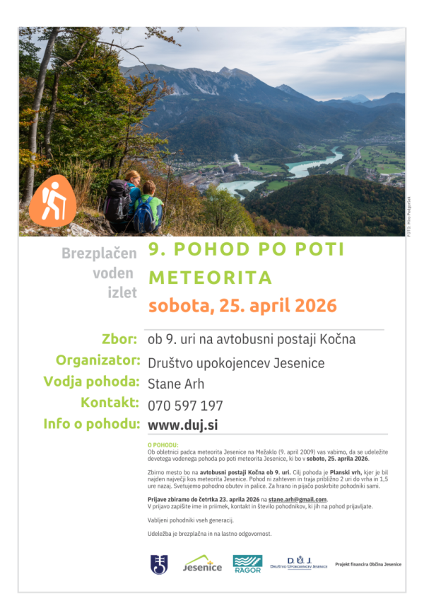 Vabimo vas, da se nam pridružite na 9. pohodu po poti meteorita Jesenice, ki bi v soboto, 25. 4. 2026 s startom na avtobusni postaji Kočna (Poljane). Organizira ga Društvo upokojencev Jesenice. Več na plakatu spodaj.