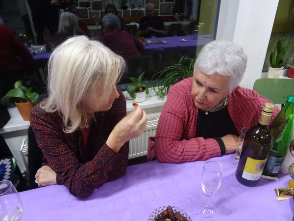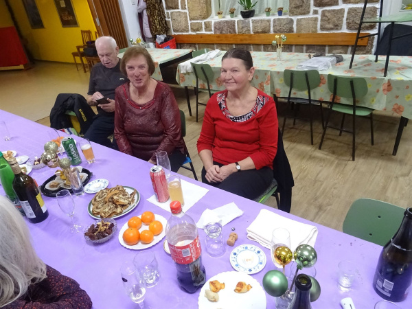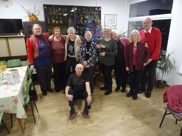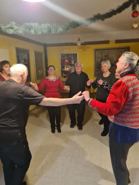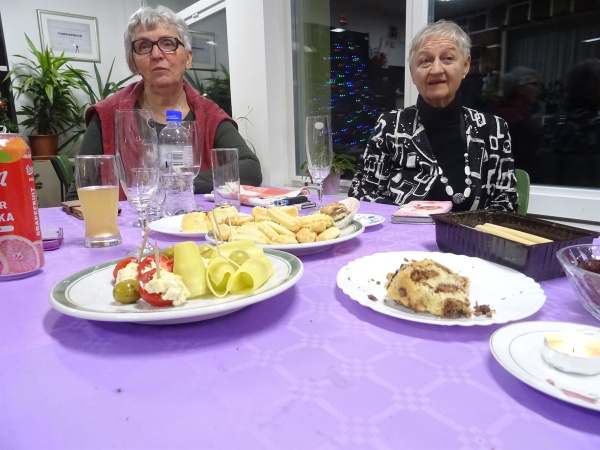 Ansambli so postali predragi, zato plešemo na posneto muziko. Letos nam jo je izbiral Alojz Pukšič in vedno je bil vsaj en par na plesišču. Ob klepetu, šalah, petju in drugih aktivnosti je čas hitro mineval in skoraj bi zamudili polnoč. Še dobro, da so nas opozorili na novo leto z ognjemetom na Čufarjevem trgu. Nazdravili smo s šampanjcem, si voščili srečno leto 2026, zapeli Silvestrski poljub in zaplesali dunajski valček. Potem je bilo pet minut prosto za telefoniranje in pošiljanje telefonskih voščil.