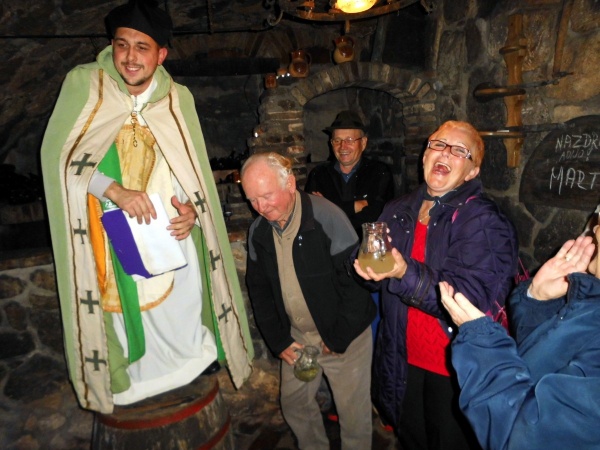 Na vmesnem postanku na Trojanah smo pojedli sicer vsak po en krof, a Martinovo kosilo nam je izvrstno teknilo. Po kosilu smo se odpravili v zidanico, da krstimo letošnji mošt in ga spremenimo v vino. Protokol je bil temeljit in po pravilih, zato smo dobili odlično novo vino. Dolgo smo se zadržali v zidanici. ker je bilo veliko dobre jedače in smo smeli točiti vino iz vseh sodov brez plačila, kolikor nas je bila volja. Pa mi smo ja pravi Gorenjci. Še v žepe smo si nalivali vino, da ga nesemo s seboj, ker je bilo zastonj.