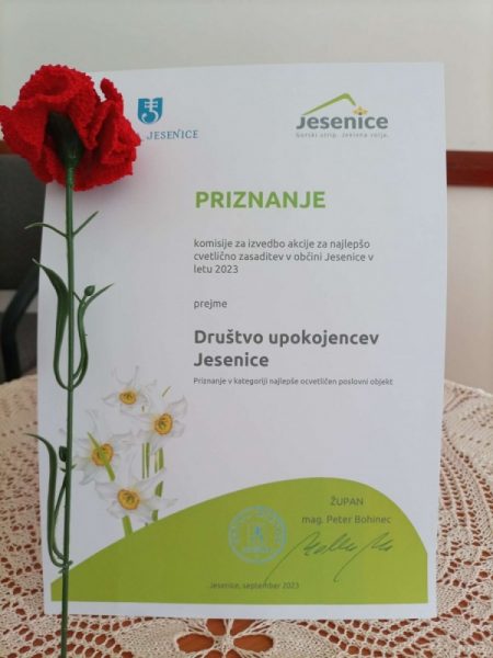 Na zaključku akcije z naslovom Najlepša cvetlična zasaditev, ki je potekala v Kolpernu, je za cvetlično zasaditev prejelo priznanje tudi naše Društvo upokojencev Jesenice v kategoriji poslovnih prostorov. Na to priznanje smo lahko ponosni, saj je potrditev, da naš trud opazijo tudi drugi in da urejanje okolice našega doma ni “brez veze”. Priznanje bo vzpodbuda, da se bomo potrudili in še lepše uredili okolico našega doma.