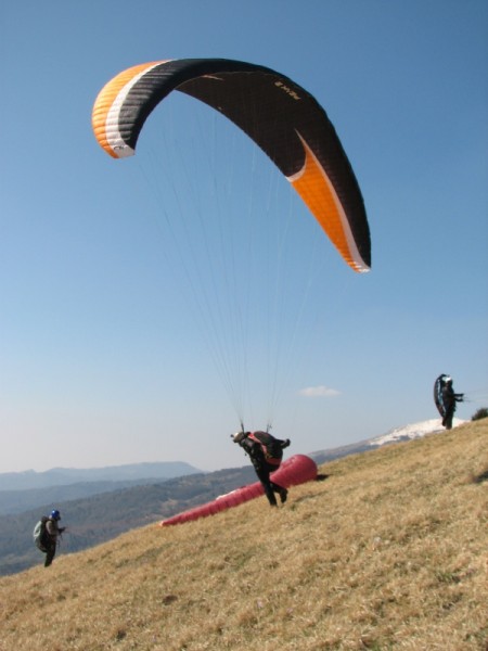 Na vrhu Kuka smo srečali padalce iz Kranjske Gore, ki so poleteli iz Kuka čez Alpe nazaj domov v Kranjsko Goro. Veliko pred nami so pristali v Kranjski gori.
