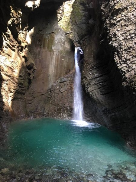 Pot nas je vodila dalje proti slapu Kozjak, naravni znamenitosti. Nenaporna  hoja je bila popestrena s  prečenjem Soče po 52 m dolgi, kar dobro »guncajoči« brvi. Nekaterim je bila hoja po brvi dobra zabava, drugi pa smo bili previdni. Nič kaj dosti nismo pogledovali navzdol proti bistri Soči in smo kar skoncentrirano in nekoliko v strahu drobili čez na drugo stran.  Zavita pot nas je pripeljala do slapa Kozjak. Res je čudo narave. V njegovi senci je počivala korenina, dodobra obdelana z vodo, gladka kot polakirana. Mene je spominjala  na stisnjeno pest.