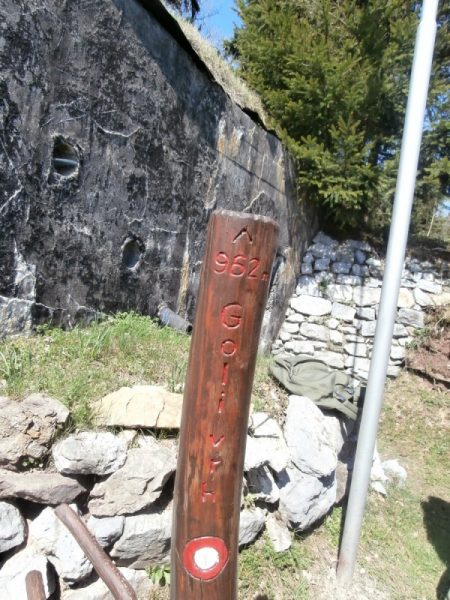 Med potjo smo opazili  na pobočjih vojaške bunkerje,  ki jih je že zaraščalo mlado ruševje. Razvozlali smo naš neznani pohod.   Hodili smo po »Rupnikovi liniji«, ki je potekala od Radovljice, preko Ratitovca, Blegoša, Žirovskega  vrha, Golega vrha, Sv. Treh kraljev,  Vrhnike….   Po dobri uri in pol hoje nas je pri kmetiji čakal  g. Peter, ki je prevzel vodenje. Z njim  smo dosegli    »Goli vrh«   (962 m). Tu  smo  imeli  krajši   postanek,  med katerim nam je vodič Peter  osvežil zgodovino Avstro – Ogrske  in pomen «Rupnikove linije«.  Ogledali smo si tudi notranjost bunkerja,  ki ga je vodič Peter obnovil v svoji režiji in uredil v njem manjši  razstavni prostor.