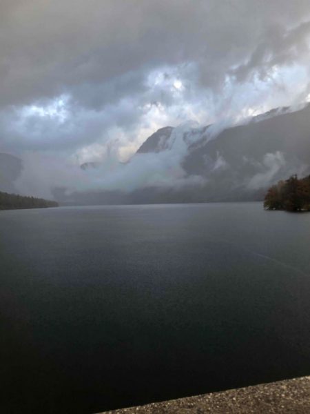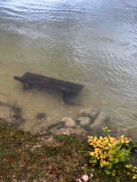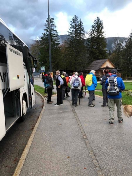 Nekateri z dežnimi plašči, drugi z dežniki, vsi pa dobre volje smo se izogibali lužam, majhnim potočkom in ogledovali ponovno nastalo škodo, podrta drevesa, poplavljeno obalo jezera. Kako drugače v tem času tu, ko ni turističnega vrveža, prometa, srečali smo komaj nekaj osebnih avtomobilov, en turistični avtobus in nekaj delovnih vozil.