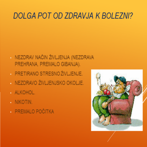 Vsi želimo biti zdravi, a pogosto ne naredimo nič, da bi si zdravje dolgo ohranili in uživali v življenju. Celo več, skrbimo, da si zdravje uničujemo s cigareti, alkoholom, mamili, nezdravo hrano, telesno neaktivnostjo, preveliko telesno težo, sedenjem ob TV in računalniku, z intelektualno neaktivnostjo, s stresi. Prepričani smo, da nam bo ob bolezni zdravnik priporočil čudežno tabletko, ki nas bo hitro povrnila zdravje. Telo ima močan obrambni mehanizem, zato bolezen potrebuje običajno dolgo časa, da se razvije in ogrozi naše zdravje. Kaj ni zato nelogično razmišljanje, da bolezen lahko pozdravimo v hipu. Za krepitev obrambnega mehanizma je potreben zdrav življenjski slog.