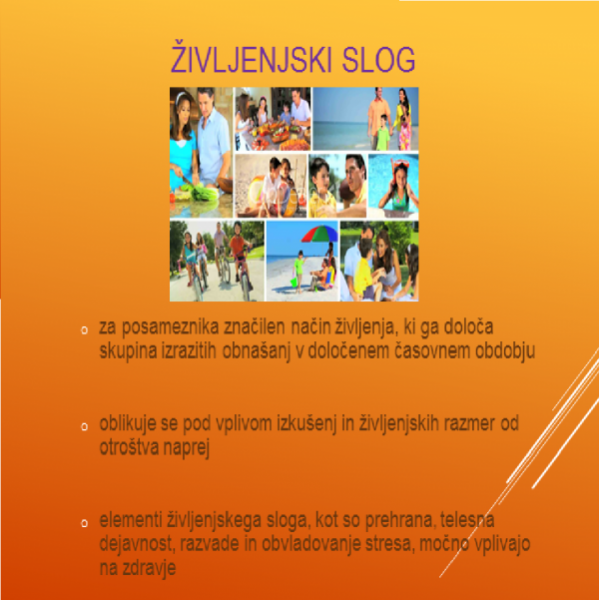 Predavateljica Ksenja Noč nam je zelo natančno opisala in razložila, kaj je to zdrav življenski slog, ki nam ohranja zdravje v pozno starost. Zavedati se moramo, da sami lahko kontroliramo in kreiramo okoli 90 % svojega življenja, le okoli 10 % dogajanja je neodvisno od nas, naše volje in naše dejavnosti. Torej smo za bolezen sami odgovorni in jo sprožamo z našim življenjskim slogom. Elementi življenjskega sloga, kot so prehrana, telesna dejavnost, razvade in obvladovanje stresa, močno vplivajo na zdravje.